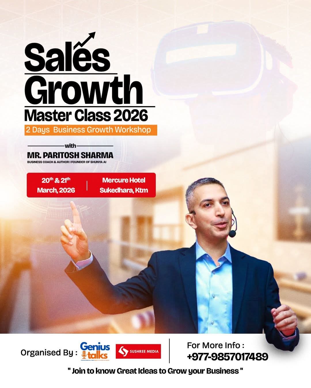 काठमाडौँ । नेपालका व्यावसायिक तथा औद्योगिक क्षेत्रका अग्रणी व्यक्तित्वहरुको सहभागितामा, प्रख्यात अन्तर्राष्ट्रिय उत्प्रेरक वक्ता पारितोष शर्माको विजनेस वर्कसप “सेल्स ग्रोथ मास्टर क्लास“ कार्यक्रम यही २०८२चैत्र ६ र ७ गते काठमाडौंस्थित होटल मक्र्योरमा जिनियस टक्स र सुश्री मिडियाको संयुक्त आयोजनामा हुने भएको छ ।