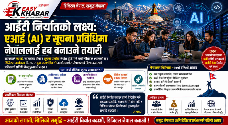 काठमाडौं । नेपाललाई एआई (Artificial Intelligence) र सूचना प्रविधि (आईटी) निर्यातको हब बनाउने लक्ष्यसहित सरकारले नयाँ नीतिगत पहलहरू अघि बढाएको छ।